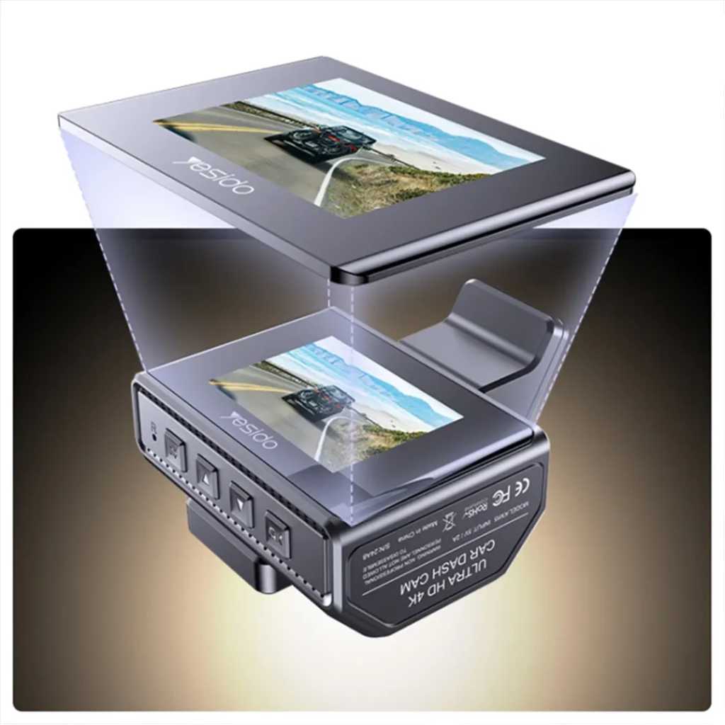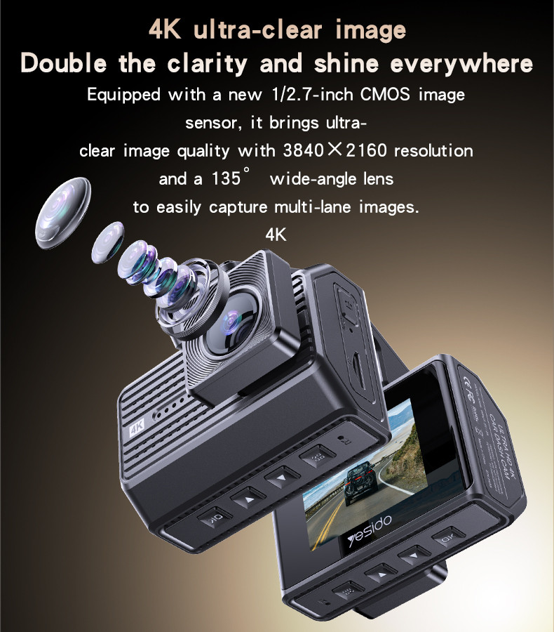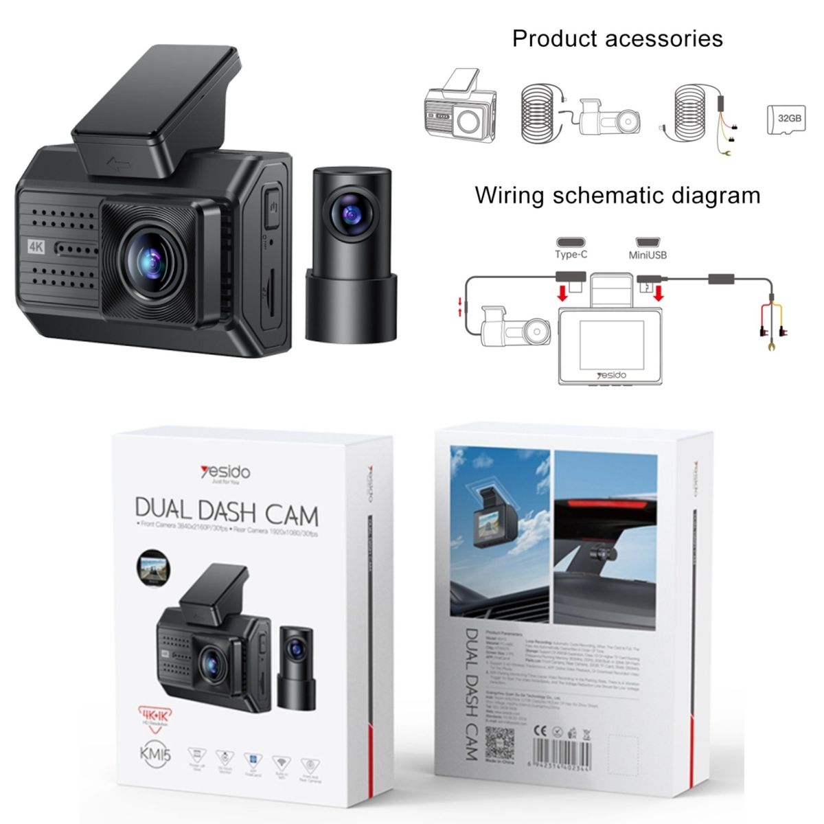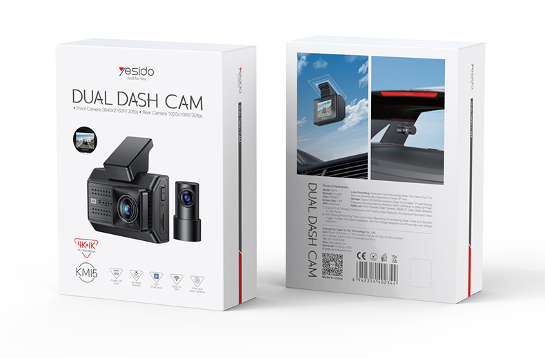 Yesido KM15 4K Driving Recorder Key Features: 1. Material: PC+ABS. 2. Chips: NT96670. 3. Sensor: GC4653 (front) / GC2083(back). 4. RAM: 2G/32Mb. 5. ROM: Max 256G TF card. 6. Pixel: Max 4K/1K. 7. Max 24 hours Circle Record (256G) 8. With a 32Gb TF card.
