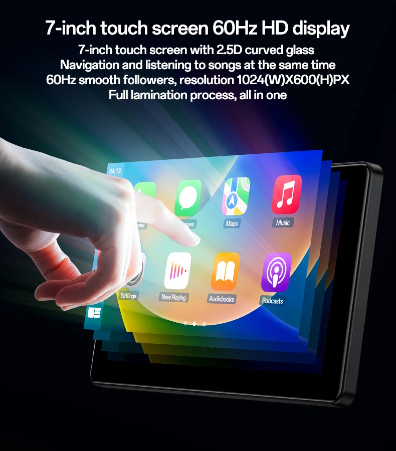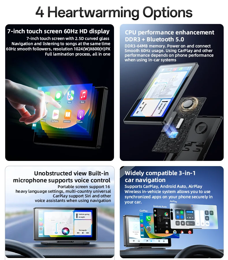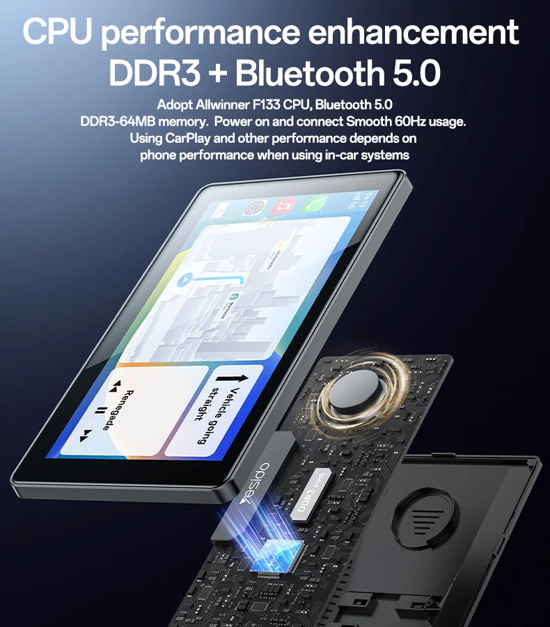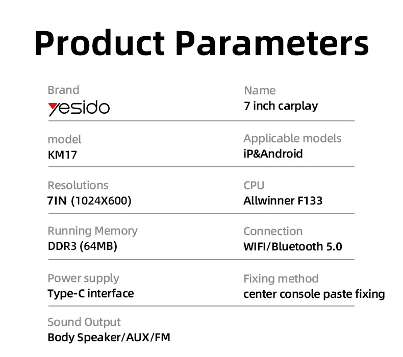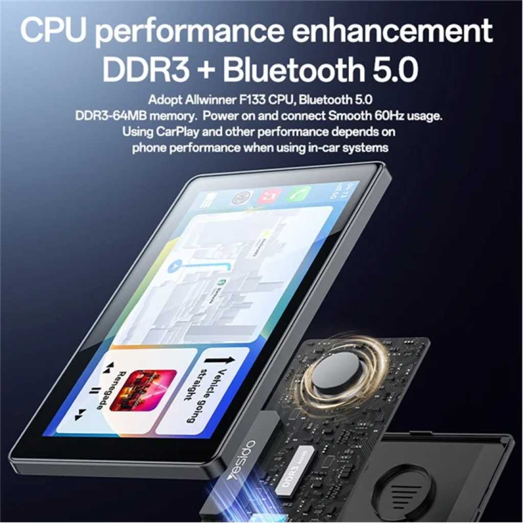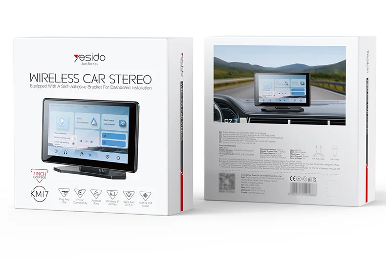 YESIDO KM17 7-inch Car Driving Recorder WiFi + Bluetooth Carplay Android Auto Multimedia Player for iPhone Android 7-inch touch screen 60Hz HD display: 7-inch touch screen with 2.5D curved glass, navigation and listening to songs at the same time. 60Hz smooth followers, resolution 1024(W)X600(H)PX CPU performance enhancement DDR3+Bluetooth 5.0: DDR3-64MB memory, power on and connect. Smooth 60Hz usage. Using CarPlay and other performance depends on phone performance when using in-car systems Unobstructed view Built-in microphone supports voice control: Portable screen support 16 heavy language settings, multi-country universal CarPlay support Siri and other voice assistants when using navigation Widely compatible 3-in-1 car navigation: Supports CarPlay, Android Auto, AirPlay. Wireless in-vehicle system allows you to use synchronized apps on your phone securely in your car Outstanding sound quality, Comes with speaker output: The portable screen is configured to connect to the car stereo in three ways. AUX connection, Bluetooth connection and FM band connection are supported Strong adhesive base, Adapt to 99%of cars: Stable adhesion, complex road conditions, wild shaking does not fall off. Strong adhesive, suitable for 99%of car interiors, one-click installation