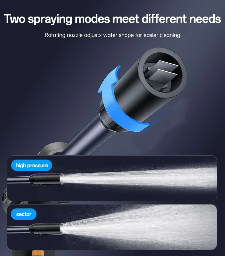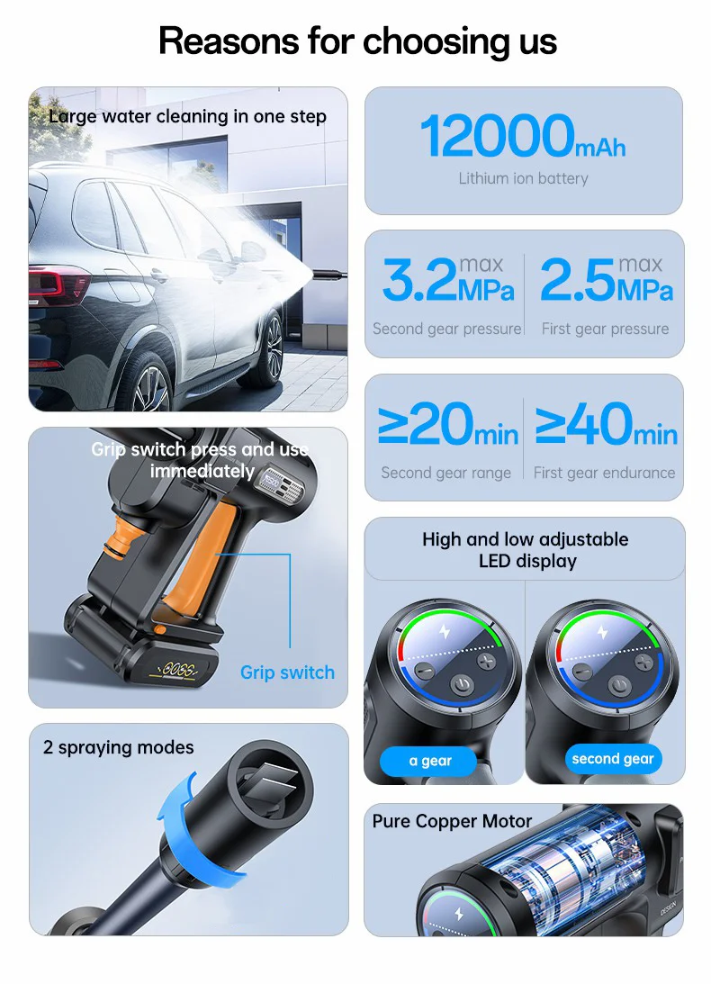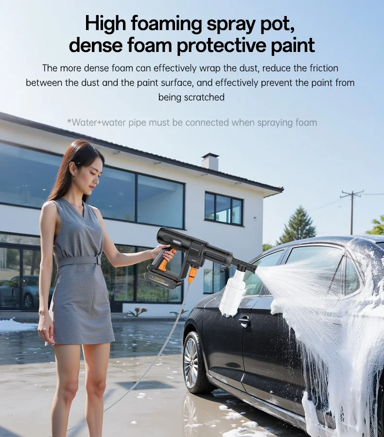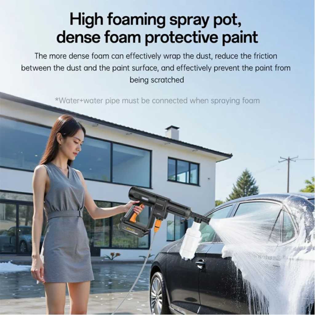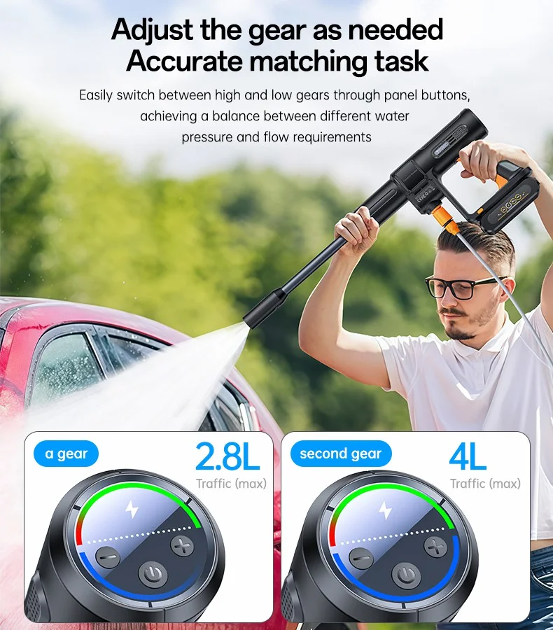 Key Features: 【Powerful Dual-Mode Cleaning】Second gear delivers 3.2MPa with 4L/min flow rate, while first gear offers 2.5MPa with 2.8L/min, suitable for various cleaning tasks. 【Long-lasting Battery Performance】Equipped with a 12000mAh lithium battery pack, providing up to 40 minutes of continuous use in low-pressure mode and 20 minutes in high-pressure mode. 【Smart PID Control System】Utilizes PID algorithm for motor control, ensuring stable water pressure and efficient operation. 【LED Display and Dual-Mode Adjustment】Clear LED screen shows battery level and pressure mode, easily adjustable between high and low settings for versatile cleaning. 【Versatile Nozzle Design】Rotatable nozzle offers both high-pressure jet and fan spray patterns, adaptable for various cleaning scenarios. 【Foam Bottle Attachment】Includes a foam bottle for generating thick foam, protecting car paint during washing. 【Cordless Convenience】Wireless design frees you from power cord constraints, allowing flexible use in multiple locations.