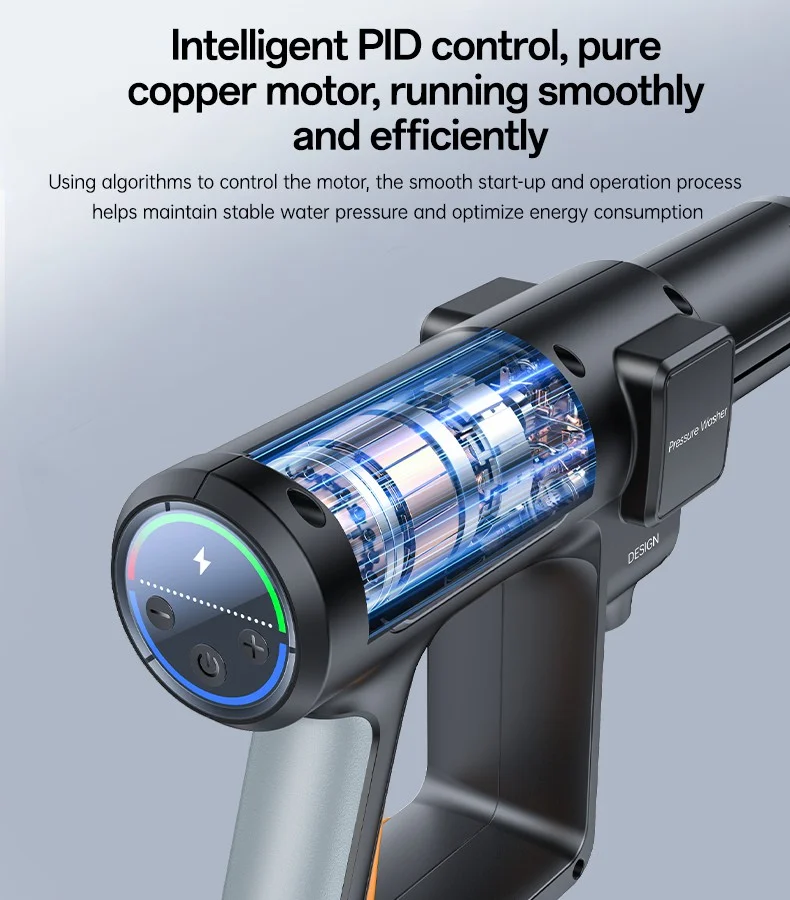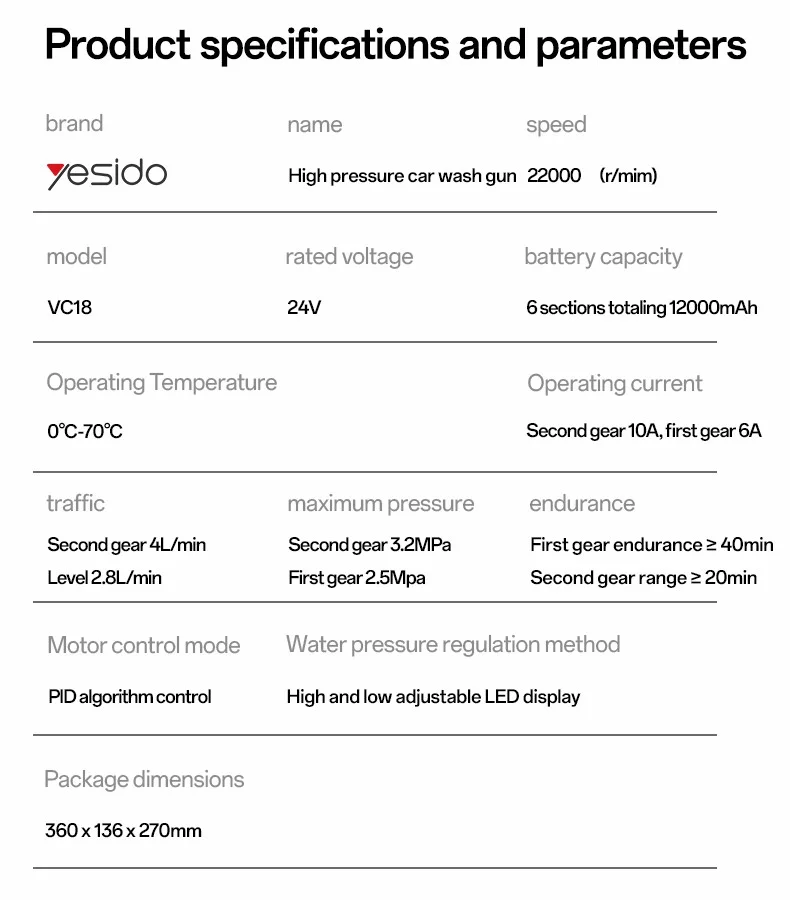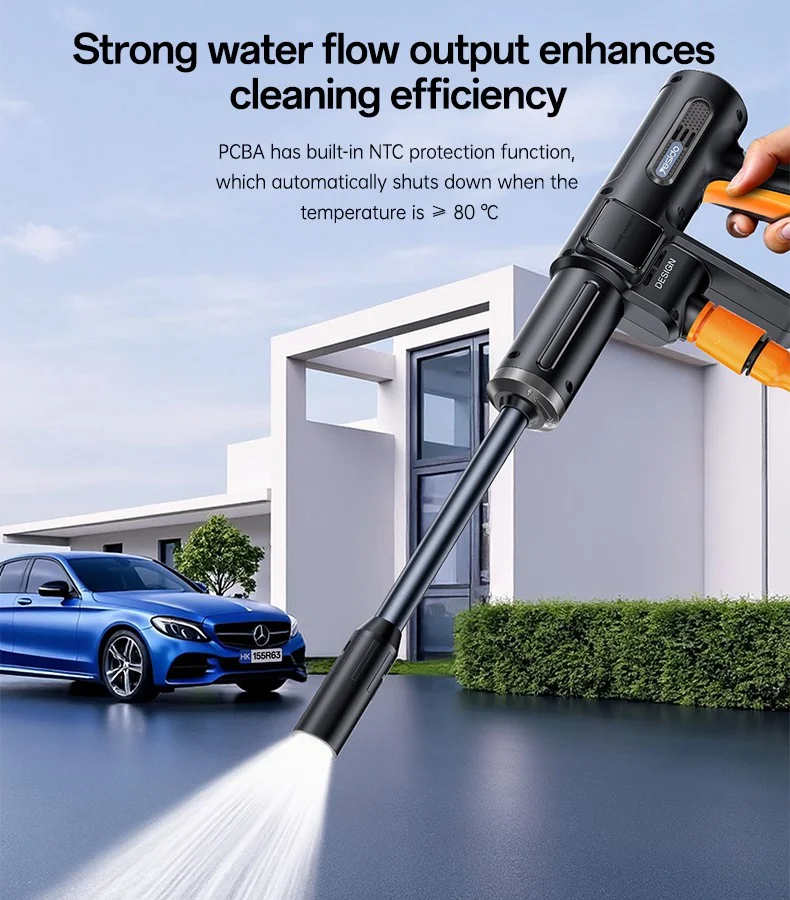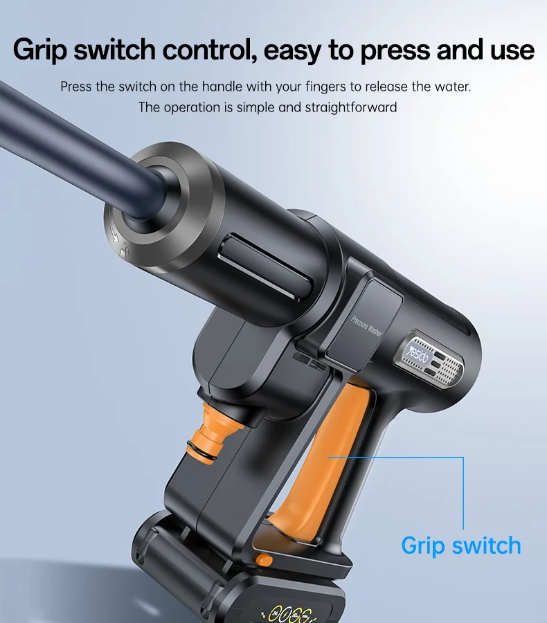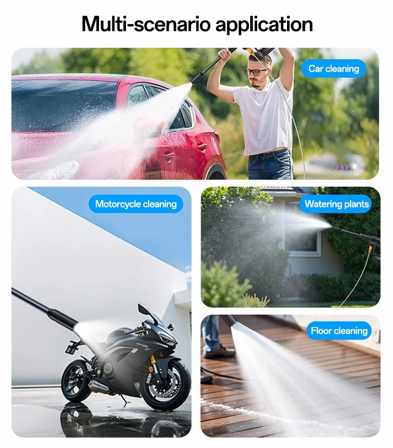 Key Features: 【Powerful Dual-Mode Cleaning】Second gear delivers 3.2MPa with 4L/min flow rate, while first gear offers 2.5MPa with 2.8L/min, suitable for various cleaning tasks. 【Long-lasting Battery Performance】Equipped with a 12000mAh lithium battery pack, providing up to 40 minutes of continuous use in low-pressure mode and 20 minutes in high-pressure mode. 【Smart PID Control System】Utilizes PID algorithm for motor control, ensuring stable water pressure and efficient operation. 【LED Display and Dual-Mode Adjustment】Clear LED screen shows battery level and pressure mode, easily adjustable between high and low settings for versatile cleaning. 【Versatile Nozzle Design】Rotatable nozzle offers both high-pressure jet and fan spray patterns, adaptable for various cleaning scenarios. 【Foam Bottle Attachment】Includes a foam bottle for generating thick foam, protecting car paint during washing. 【Cordless Convenience】Wireless design frees you from power cord constraints, allowing flexible use in multiple locations.
