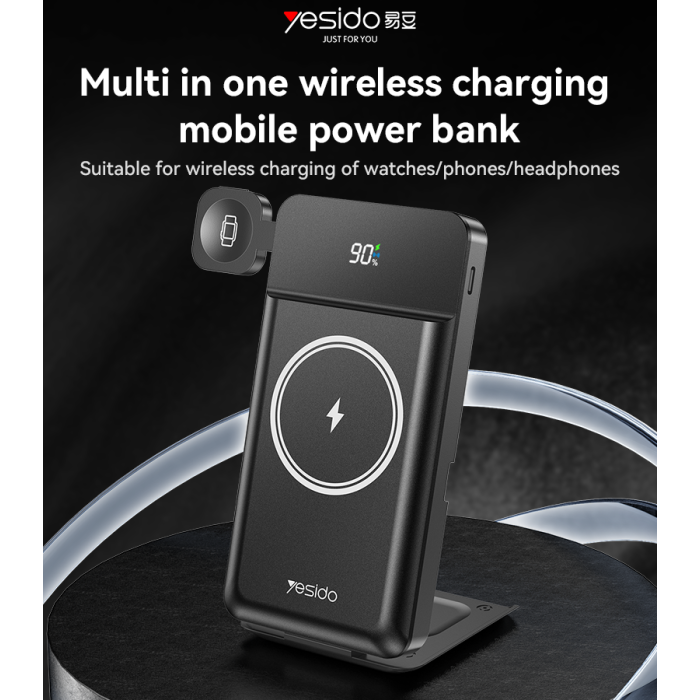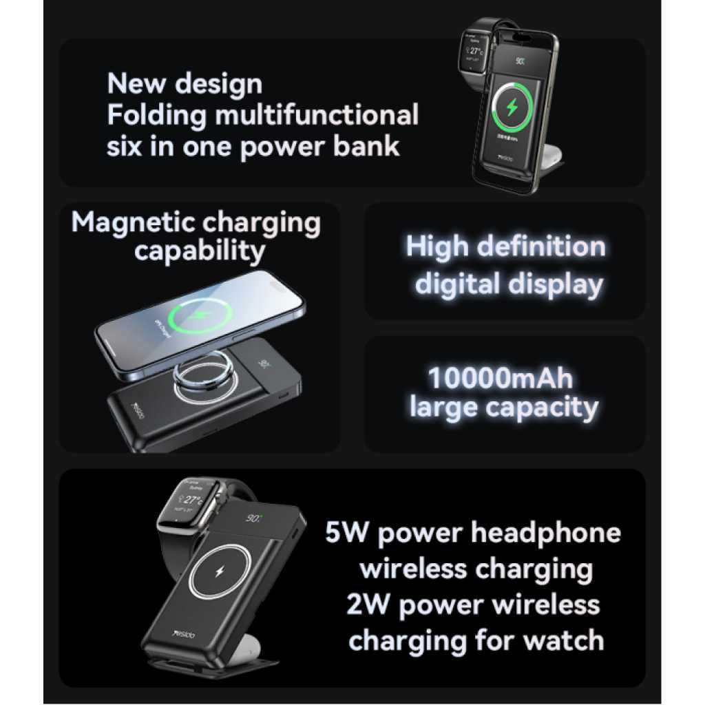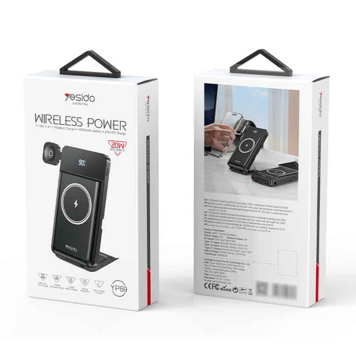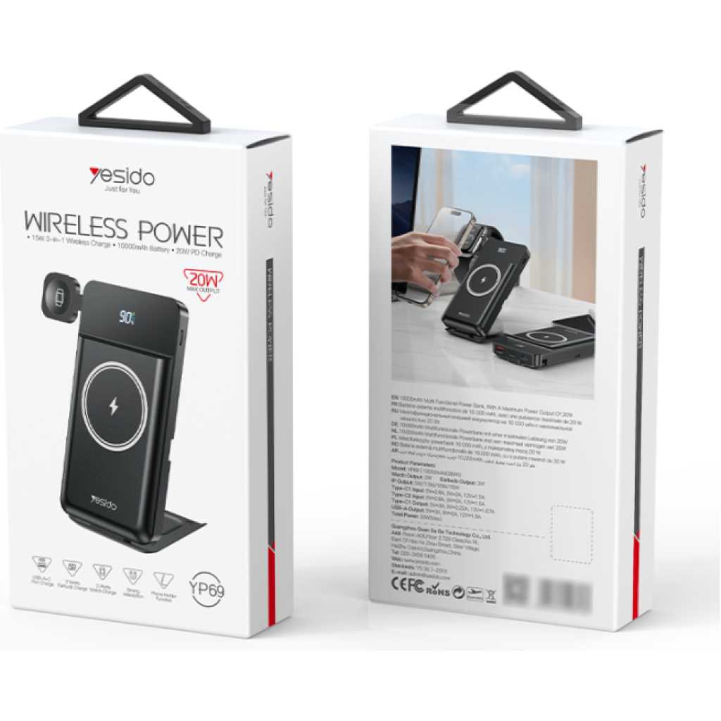 Yesido YP69 10000mAh Magnetic Charging USB & Type-C Multi Functional 15W Wireless Charging Power Bank. Our Power Bank is a 10000mAh high-power ly-polymer battery. Total Max 15W can help support many kinds of device charging. AS 10000mAh power bank. As a 15W magnetic wireless charging Stand for mobile / TWS. As 2W Watch wireless charging stand. 2 TC input (Max 18W). TC 1 output Max 20W. USB ourput Max 22.5W. With LED power display screen. Key Features: Yesido YP69 10000mAh Magnetic Charging USB & Type-C Multi Functional 15W Wireless Charging Power Bank. Our Power Bank is a 10000mAh high-power ly-polymer battery. Total Max 15W can help support many kinds of device charging. AS 10000mAh power bank. As a 15W magnetic wireless charging Stand for mobile / TWS. As 2W Watch wireless charging stand. 2 TC input (Max 18W). TC 1 output Max 20W. USB ourput Max 22.5W. With LED power display screen.
