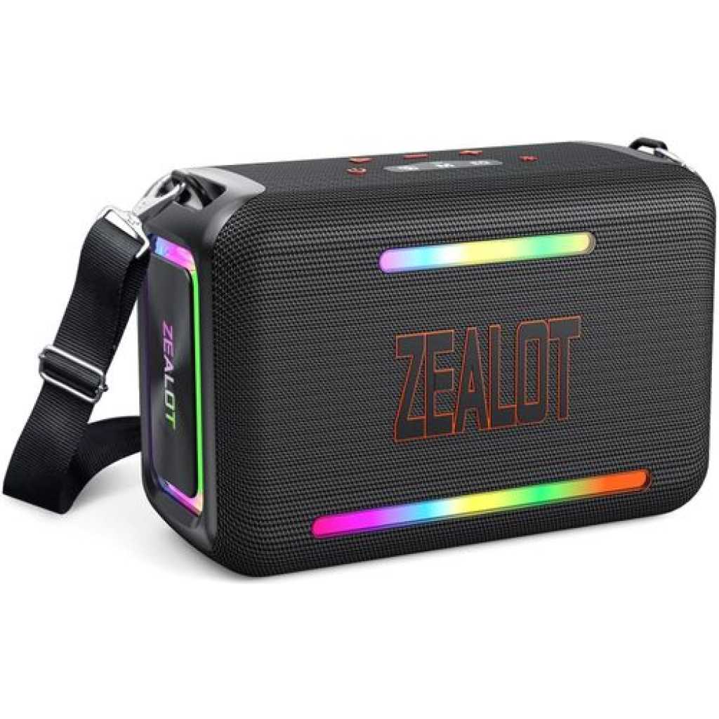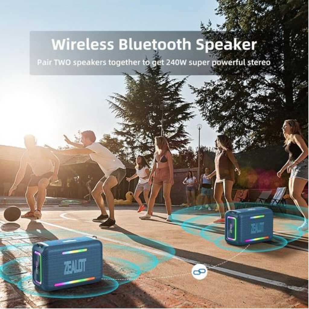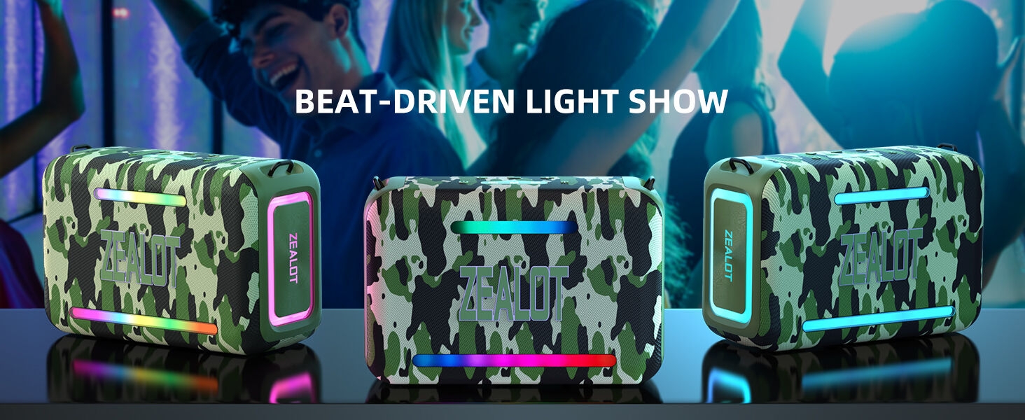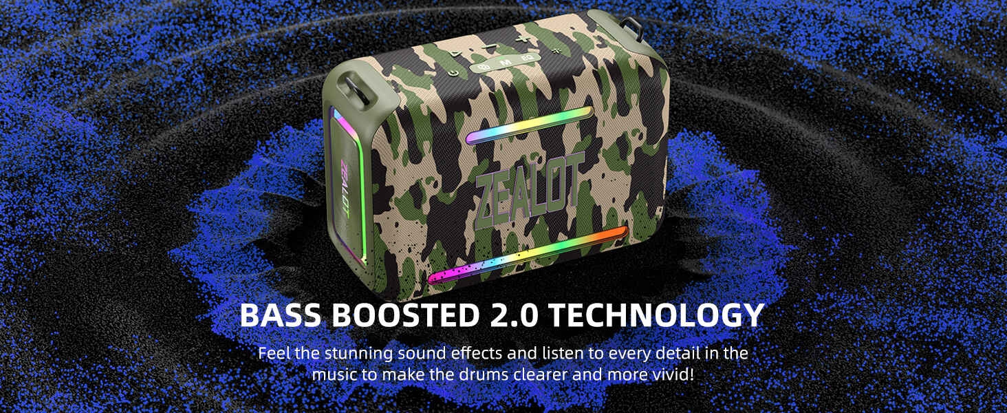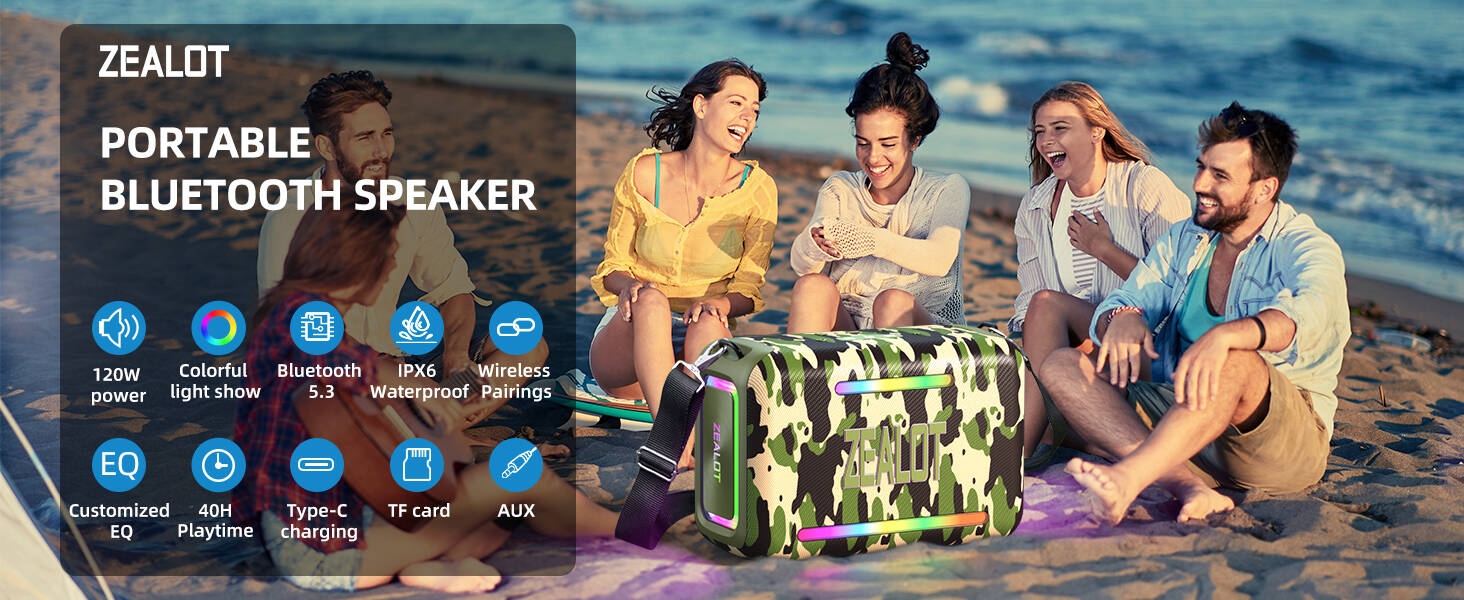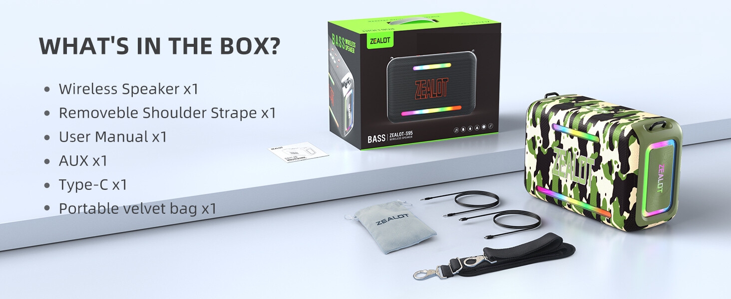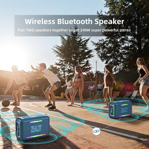 Key Features: 【120W High Power Speaker】120W Loud Bluetooth Speaker equipped with 2*50W subwoofer, 2*10W tweeters and advanced DSP chip to achieve clearer mid-highs, rich and smooth zero-distortion sound, and high-frequency sound up to 40kHz is significantly clearer. 【IPX6 Waterproof Speaker】Zealot water proof Bluetooth speaker is IPX6-rated and very resistant to heavy sprays of water from all directions. It is ideal for outdoor activities such as camping, riding, boating trips, or beach trips. 【Party Wireless Speaker and EQ Mode】 Pair two Zealot S95 speaker to get 240W Max ultra stereo.The bluetooth speakers for party features an EQ button, allowing you to finely tune your audio signal for personalized listening preferences. Experience this outstanding portable home theater Bluetooth speaker for movies, gaming, and parties 【Bluetooth 5.3 and 40H Playback】Our blue tooth speaker adopt advanced Bluetooth 5.3 technology ensures fast and stable music connectivity. Not only can you connect wirelessly via Bluetooth, but you can also enjoy music using the AUX 3.5mm, TF card options and USB drive.ZEALOT portable speakers bluetooth wireless boasts a powerful battery system that provides an astounding 40 hours of playback time at minimum volume. Whether it’s a family barbecue or a camping trip, day or night, the outdoor Bluetooth speaker is designed to suit your needs. NOTE: To ensure charging efficiency, we recommend using a 9V/3A to 20V/2.25A charging adapter. 【Loud Subwoofer Speaker with Led Light Show】120W Peak Powerful Loud Sound Deep Bass Wireless Boombox with 3 colorful light mode,pump up your party with a gorgeous light show that can be synced to the pulse and rhythm of the song playing per time. You can pick up your favorite lighting color to add a stunning touch to bar dance parties, family gatherings, and everything in between.