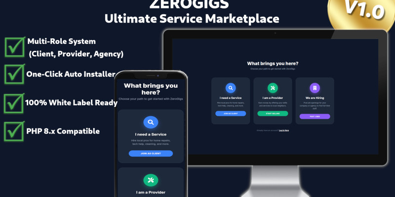 ZeroGigs - Service Marketplace PHP Script. Launch a freelance marketplace like Fiverr. Complete White-Label PHP script with 3 user roles & 1-click installer.