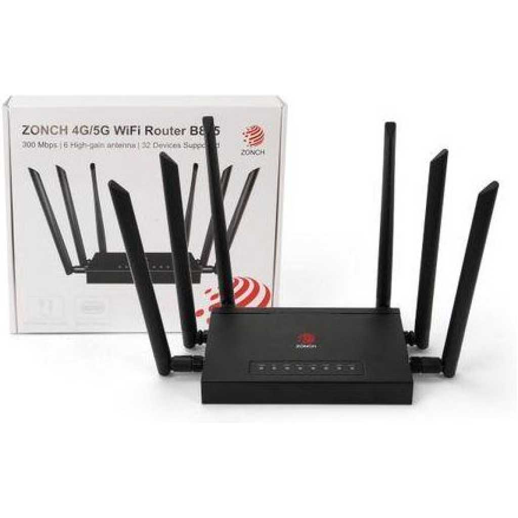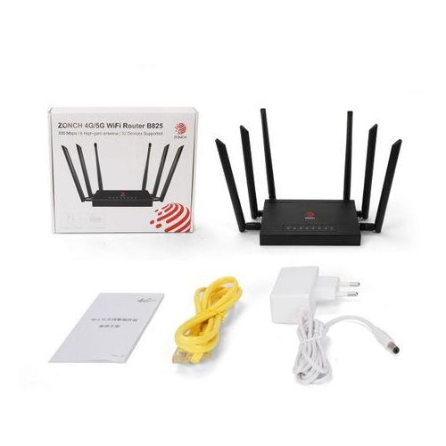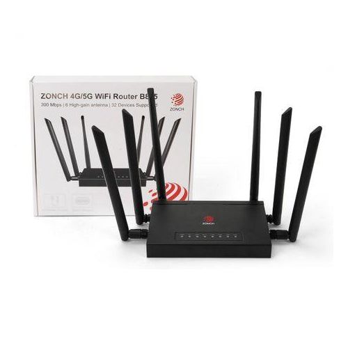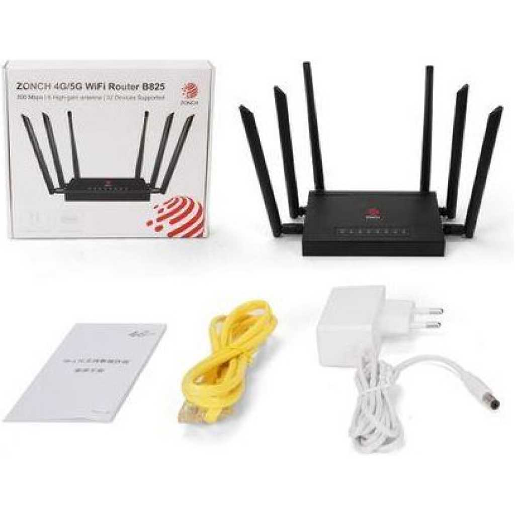 Product Features Supports a Maximum Speed of 300Mbps Supports up To 32 Users Can Connect To 6 External Antennas and Can Freely Rotate The Antennas It Has Good Multi-Antenna Reception Capabilities Insert The SIM Card and Transmit Wi-Fi Signals Easily Have The Network and Say Goodbye To The Trouble of No Network Available Insert The Card At Any Time Network Anywhere Has Multiple Working Modes 4G To Wi-Fi 4G To Wired Mode Rich Network Protocols and Reliable Connections and Can Be Widely Used In Business and Home 2.4 GHz and 300 Mbps Product Specifications Brand ZONCH Model: B825 Socket SIM Card Slot TYPE-C Hole WAN LAN Hole x 4 Power Hole Optional Frequency Bands 4G LET CPE Router Bands FDD B1 B3 B5 B7 B8 B20 B28A TDD B38 B40 B41 Up To 300Mbps LTE Download 150Mbps Upload 50Mbps What’s in the box 1 x 4G/5G WI-FI Router 300 Mbps 6 High Gain Antennas Plug & Play ZONCH B825 PK Key Features: ZONCH B825 Router is a new 4G LTE Cat4 WiFi Router which supports LTE download speed to 150Mbps and upload speed to 50Mbps. There is one LAN/WAN port in the ZONCH B825 router and it can also provide wireless connection for up to 32 wireless devices. Thanks to its Gigabit Ethernet port, you can directly wire the ZONCH B825 to your laptop, computer and TV, and enjoy high speed internet. ZONCH B825 Specifications: x 4G Transmission Rate: 150 Mbps / 50 Mbps(Theoretical value. The actual rate depends on the operator.) x WiFi – Transmission Standard: 802.11b/g/n 2 x 2, MIMO – Wireless Transmission Rate: 300 Mbps – Wireless Frequency Band: 2.4 GHz x Antenna – External Antenna: 6 x LTE antenna extension port, allowing users to purchase antennas – 5G/4G Antenna Type: LTE main and diversity antennas – WLAN Antenna Type: 2.4 GHz Wi-Fi built-in antenna x Processors/CPU: ASR chipset x Network Port: 4 GE port, 1 SIM card slot (Nano-SIM) x Button: Reset/Power/H, compatible with WPS x Power Supply – Power: < 12 W – AC/DC Power Supply: – AC: 100V – 240V, 50 Hz/60 Hz – DC: 12V/1A and Type C 5V/2A What’s in the box 1 x ZONCH 4G/5G Wifi Router 1 x Power Adapter 1 x Network Cable 1 x Usb To Type c Cable