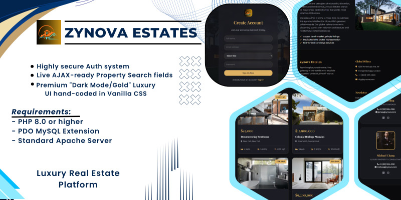 Zynova Estates - Luxury Real Estate Platform. Premium PHP MVC Real Estate script featuring an elite dark-mode UI, advanced Agent CRM, secure property management, and a 1-click