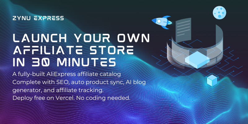 ZynU Express - AliExpress Affiliate. Next.js 14 affiliate store + AliExpress API, AI descriptions & SEO blog. Auto-post with Python scripts.